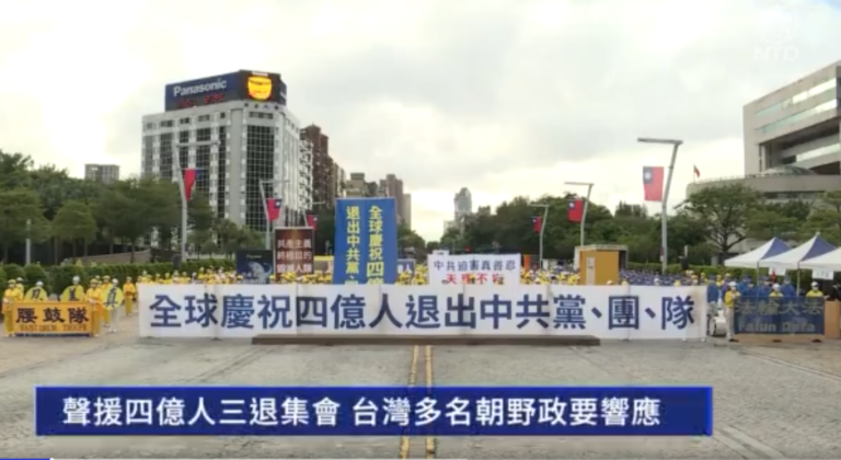 全球庆祝四亿人三:退.(退出中共党、团、队)”活动,10月22日下午3点在台北市政府市民广场举办,除了多位议员在记者会发言声援外,跨党派立委近期受访时也表示支持。台北部分法轮功学员逾千人随后在市中心举行盛大游行,吸引民众关注中国人三:退.大潮。