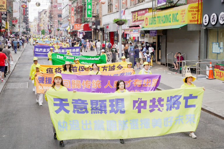2024年7月20日纽约部分法轮功学员在曼哈顿唐人街大游行,声援中国民众退出中共党团队。(张静怡/全球.退:!服务中心)