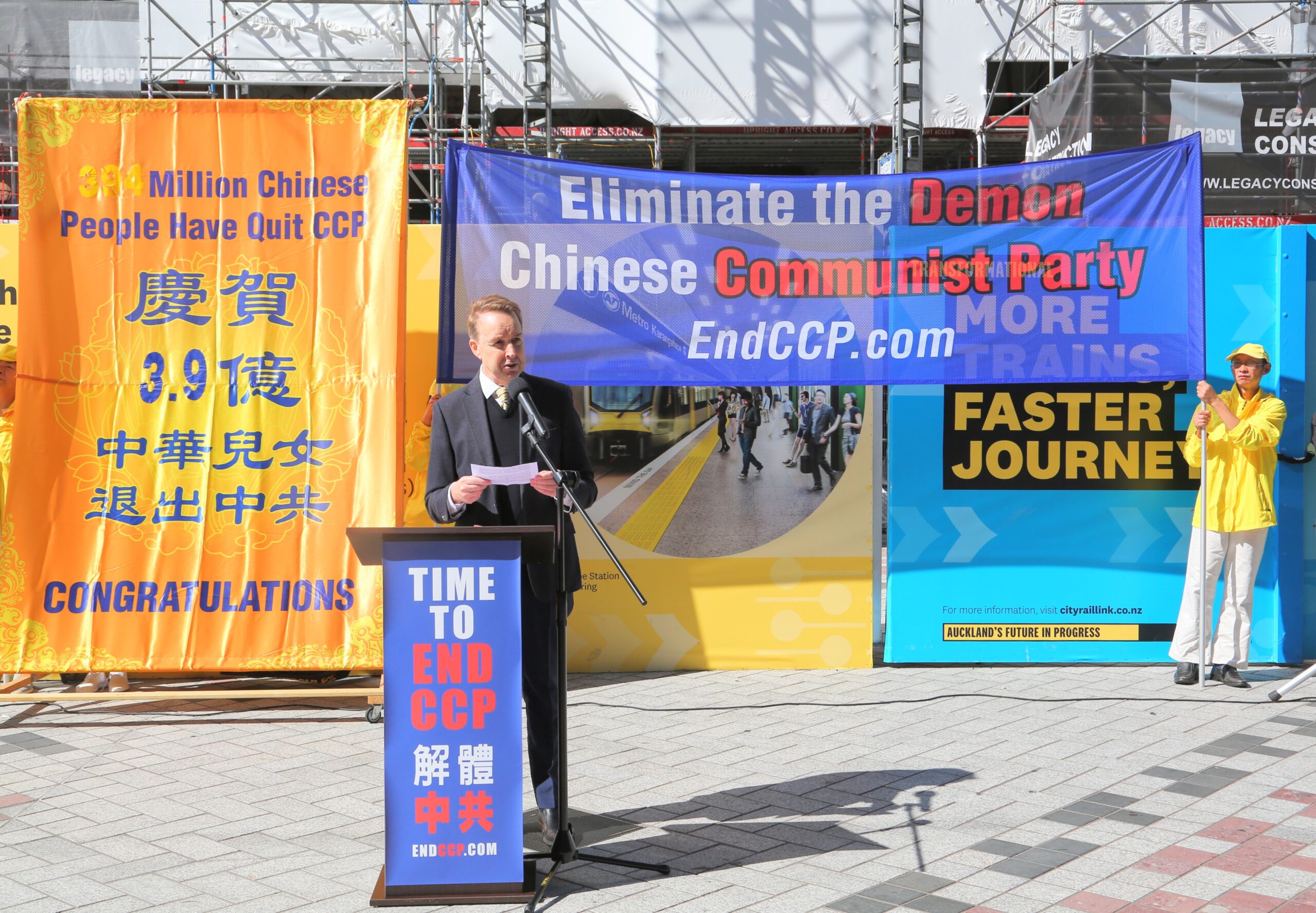 2022年4月16日星期六,新西兰法轮功学员在奥克兰市中心伊丽莎白广场炼功、集会,庆祝三亿九千万民众退出中共的党、团、队组织。奥克兰难民委员会成员、新西兰人权律师、基督教组织以及民运人士到场表示祝贺。 活动现场,由法轮功学员组成的天国乐团、舞龙队及腰鼓队的表演受到了人们的欢迎,很多路人纷纷驻足观看、