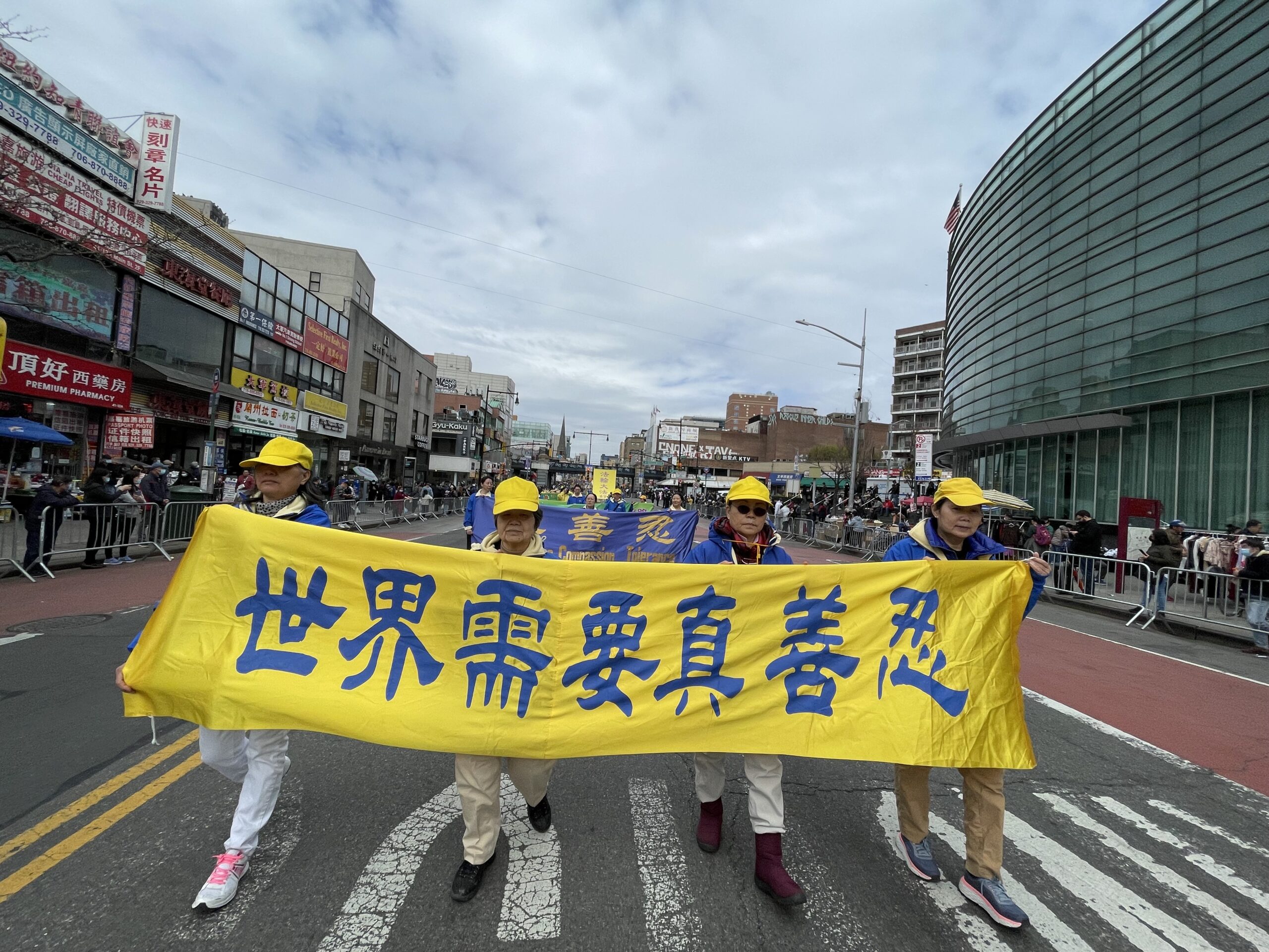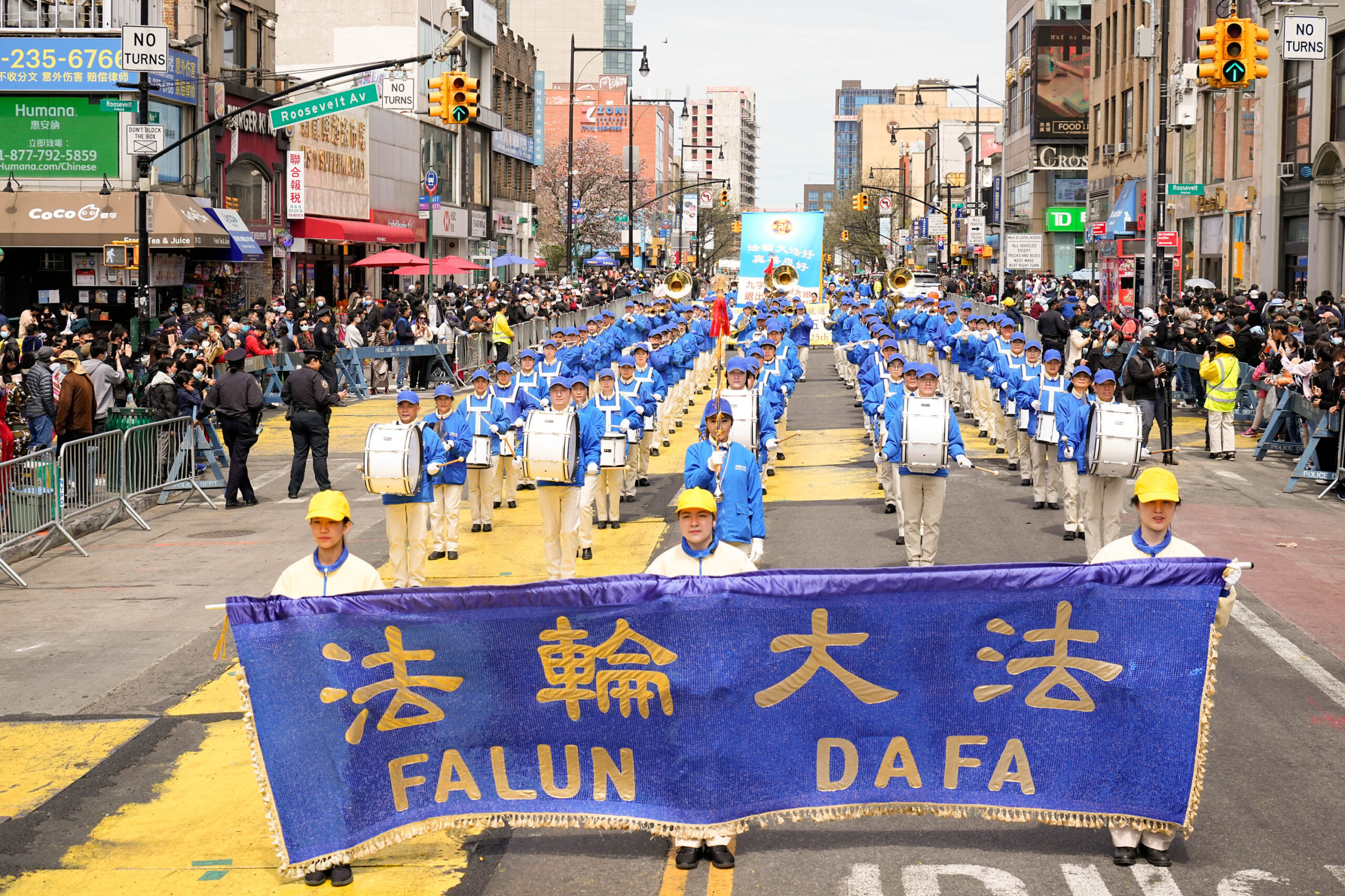 在春光明媚的日子里,声势浩大的法轮大法天国乐团,以振奋人心的音乐、精神抖擞的面貌,走在法拉盛的主干道缅街上。 他们带来了“法轮大法好”、“神圣的歌”、“送宝”等曲目,为打头阵的“法轮大法好”方阵领路。 加拿大游客:“非常惊喜能看到这个游行,真是很棒、很漂亮的游行!” 现场民众 Susan:“(乐队)