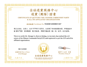 【大.纪.元;2020年08月19日讯】(大.纪.元;记者林丹纽约报导)“全球退出中共服务中心”于8月18日宣布,即日起该中心推出“在线办理退!党!证书”的服务,方便广大退出中国共产党及共青团、少先队的民众在线办理退!党!(团队)证书。 全球华人退出中国共产党的大潮汹涌澎湃,越来越多中国及世界各地华人认清中共本质,加速