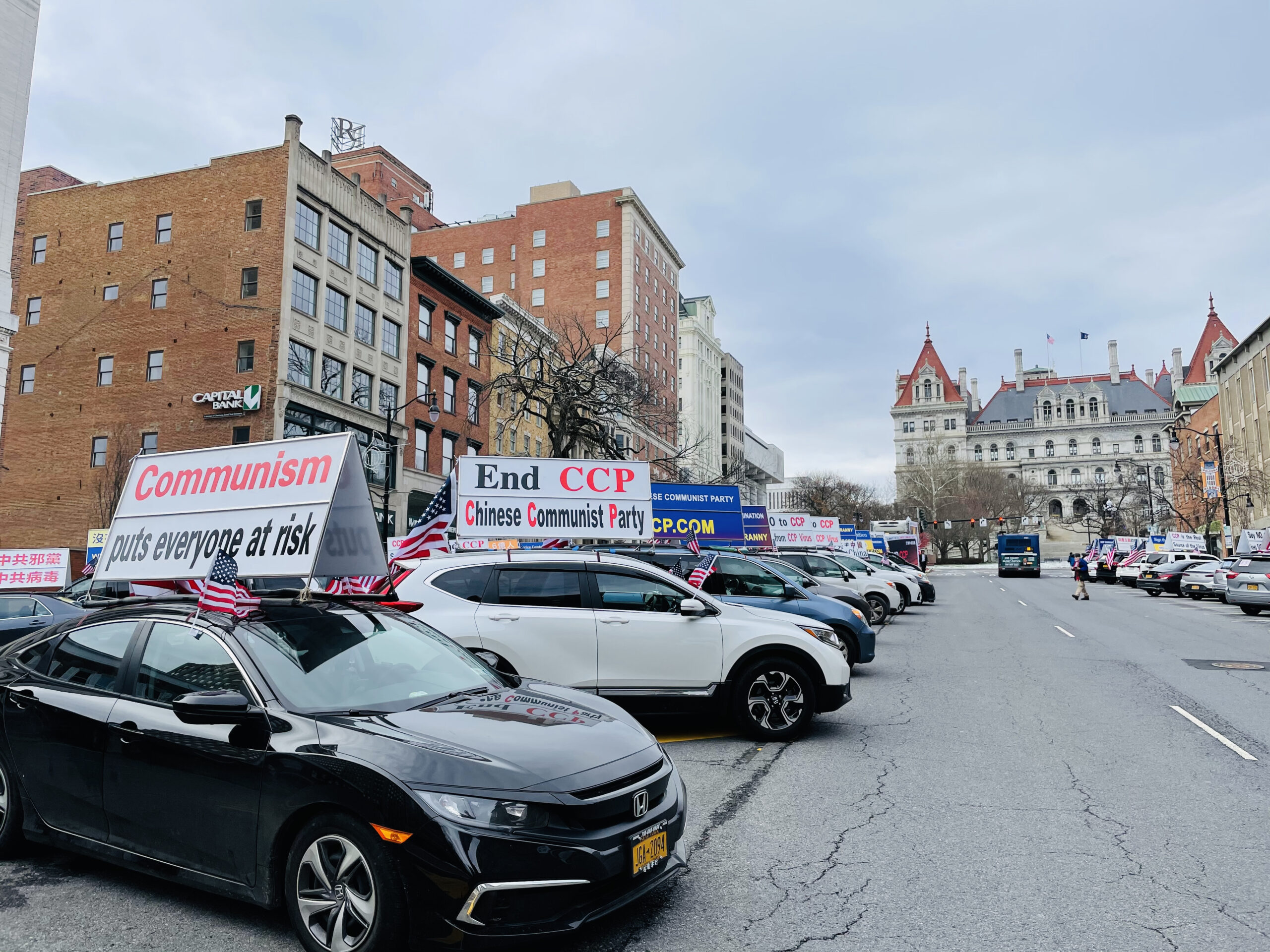 12月26日周六,“END CCP”真相车队出征纽约州首府奥尔巴尼(Albany),浩浩荡荡的四十五辆汽车围绕在州府议会大厦(East Capitol Park),民众大声呼吁“END CCP”。当天第二站来到萨拉托加(Saratoga County),民众说:“这(真相车队)是上天赐予我们的圣诞礼