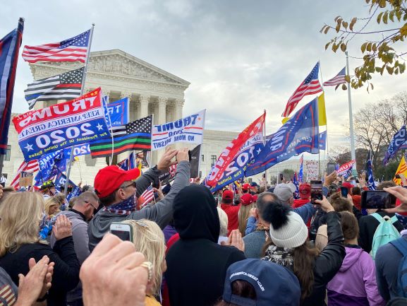 2020年12月12日美国首府华盛顿举行大型游行集会抗议大选舞弊,表达对川普总统支持,以保卫美国宪法及选举制度。活动中来自各地的数万民众旗幡招展,正气轩昂。他们表达真实心声:“川普是神的子民。”“拜登是中国制造。”“希望中国人民不再遭受共产党统治和控制。”“讨伐中共把病毒传播给全世界。”“最大的毒瘤