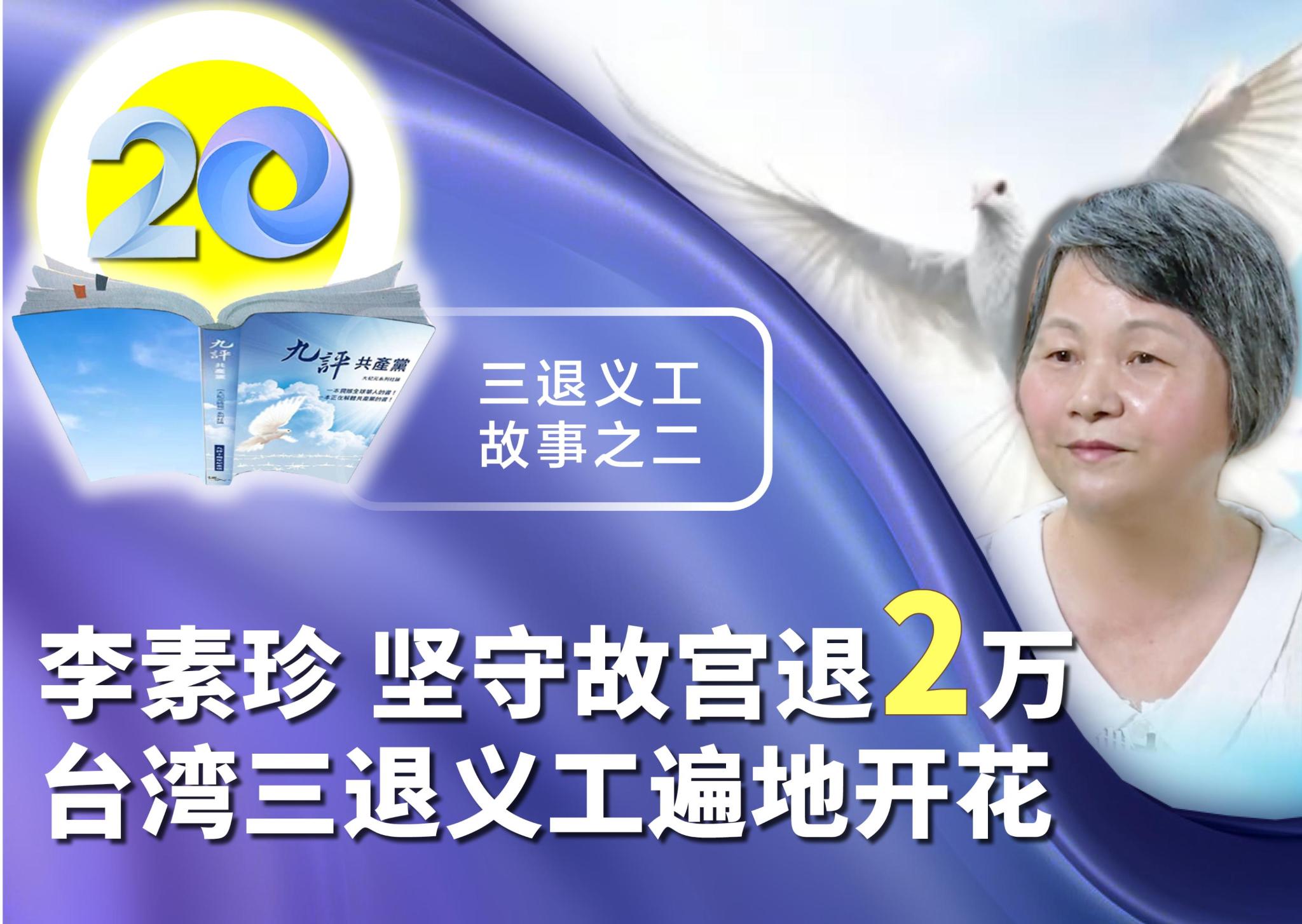 ——《·九·评*》20周年三:退.义工的故事之二 《·九·评*共产党》(简称《·九·评*》)已经发表了20年,在这20年中,全球大量的三:退.义工克服重重险阻,传《·九·评*》劝三:退.(退!党!、团、队)。这些义工都有着怎样的经历和故事,听众朋友们,今天我们继续分享他们的故事,今天的主角是:李素珍 李素珍是台湾台北市的一位三:退.义工,从2