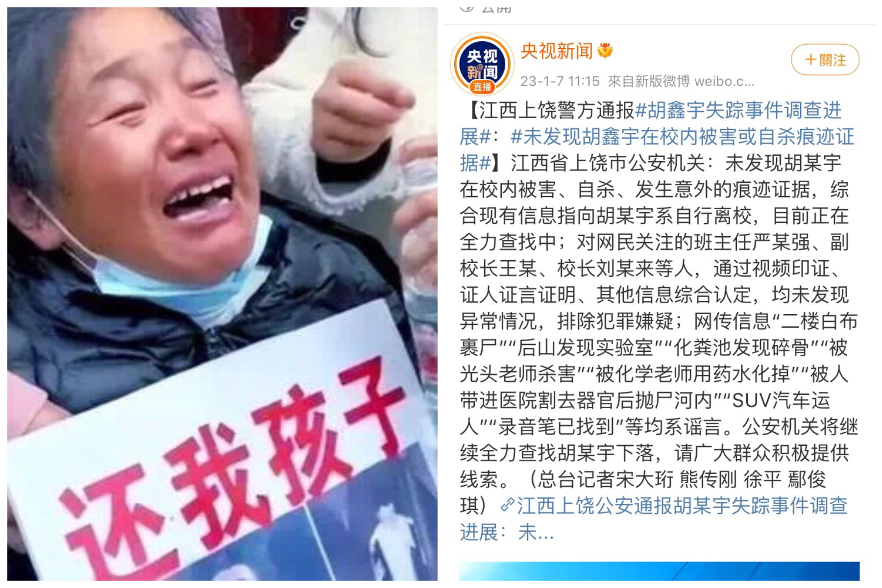 据海外媒体消息,江西上饶市致远高中高一学生、年仅15岁的胡鑫宇,10月14日在校内离奇失踪80多天毫无音讯,引发其被活摘器官的强烈质疑。网传当地人爆料,一个有罕见血型的高官得了重病,胡鑫宇的血型正好匹配。 江西上饶公安1月7日通报称,“未发现胡某宇在校内被害、自杀、发生意外的痕迹证据。综合现有信息指